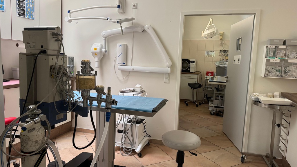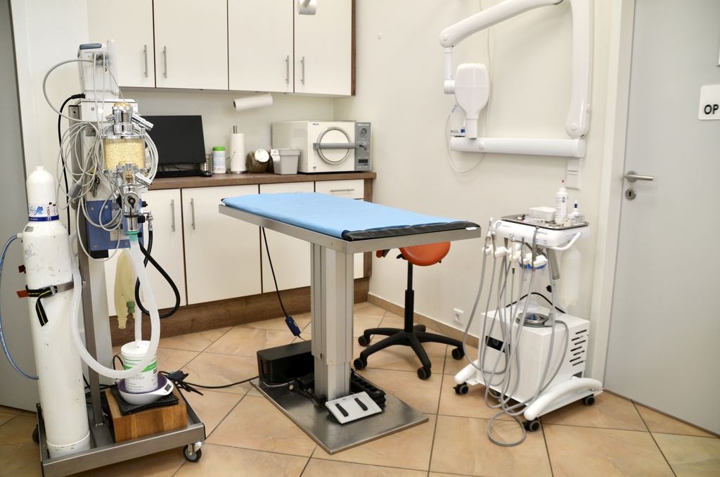 Unsterile Zahnsanierungen-/OP's, oder infizierte, unsterile Wundbehandlungen führen wir ebenfalls standardmäßig mit Inhalations-/Gasnarkose und Monitoring (EKG, SpO2, Temperatur, Blutdruckmessung) im seperaten Vorraum des sterilen OP's durch.